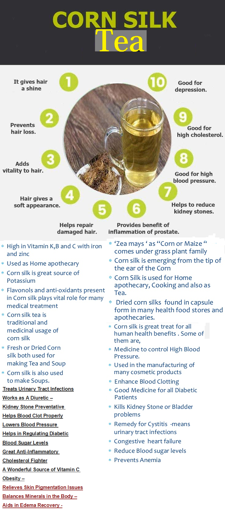 The tea is simple to prepare. A handful of corn silk is added to boiling water and allowed to steep for about 10 minutes. For urinary infections, one cup can be taken up to three times per day until symptoms ease. Corn silk can also be applied externally as a poultice for boils, wounds and skin ulcers.