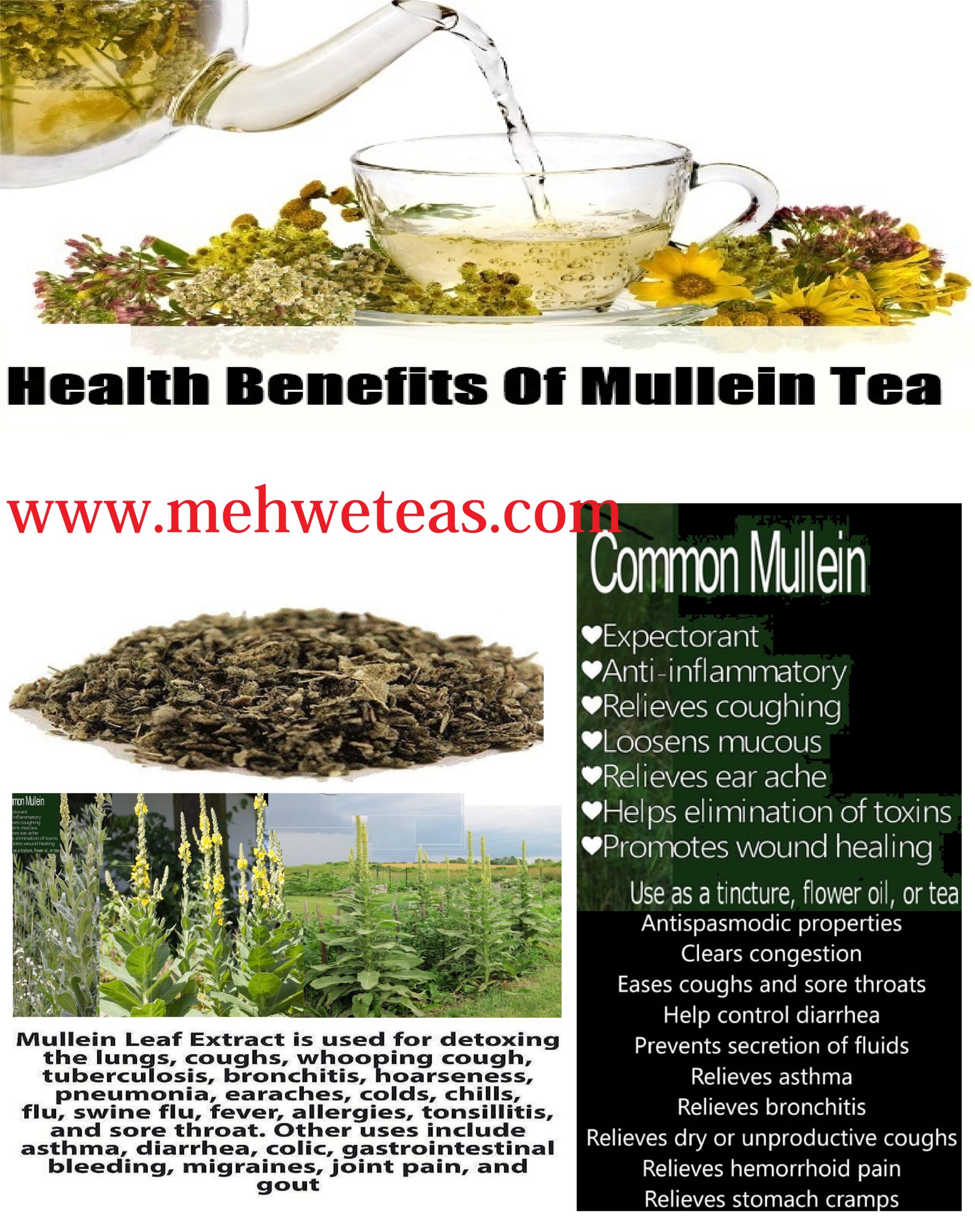 Mullein tea is prepared from the dried leaves and flowers of the plant. When steeped in hot water for a few minutes, the herb releases valuable components such as mucilage, flavonoids, iridoids, sterols and natural sugars. These compounds help reduce inflammation and relax the muscles within the respiratory system. Because of this, mullein tea is often used to support recovery from ailments like bronchitis, asthma, tonsillitis, whooping cough and pneumonia. It is also known for easing congestion and general breathing discomfort.