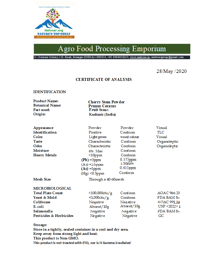 Cherry Stems have been traditionally used as a natural remedy for kidney and urinary tract health, thanks to their powerful diuretic, anti-inflammatory, antiseptic, and astringent qualities. Native to the Kashmir region and belonging to the rose family, these stems are commonly prepared as tea or powdered extract. They help increase urine production, flush out toxins, and soothe irritation in the urinary system. This makes them particularly useful for conditions such as urinary tract infections, interstitial cystitis, mild glomerular disorders, and urinary retention. Cherry Stem tea is also known to help break down small kidney stones, aiding their safe elimination.