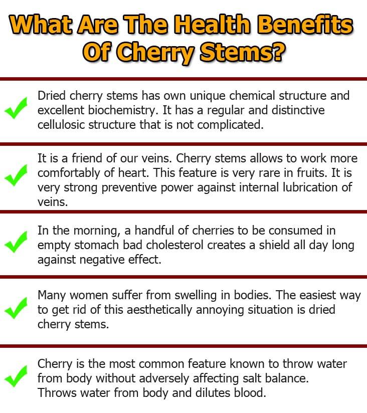 To prepare Cherry Stem tea, boil three tablespoons of stems in one liter of water for two minutes, let it steep for about 15 minutes, strain, and drink throughout the day.