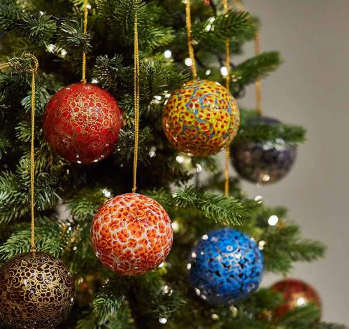 These decorative hand-painted paper mache balls showcase the craftsmanship and artistic legacy of skilled artisans. Each ball is shaped individually and painted using expressive brushwork, resulting in vibrant detailing and a polished finish. Their lightweight yet durable build makes them suitable for decorative bowls, holiday setups, boutique installations, interior styling, or professional décor arrangements. The lacquer coating enhances shine and protects the artwork, ensuring suitability for both seasonal and long-term display. Designed for wholesale décor buyers and professionals, these pieces bring together cultural craftsmanship, sustainability, and refined presentation.