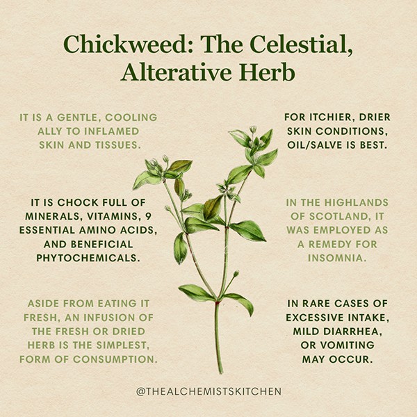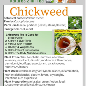 Overall, chickweed is a versatile herb that supports detoxification, healthy digestion, weight management, skin healing, and nutrient absorption. Its gentle nature and impressive nutrient profile make it a valuable addition to natural wellness routines.