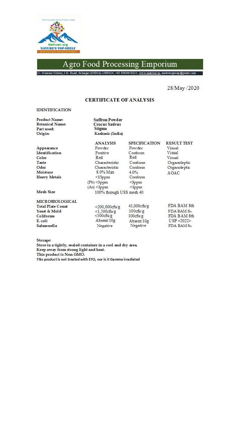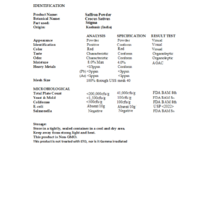 Our Organic Saffron, sourced from the pristine valleys of Kashmir, India, represents the pinnacle of quality and purity. Handpicked from the finest Crocus flowers, each thread is carefully processed using advanced freeze-drying technology to maintain its vibrant color, aroma, and potent medicinal properties. Only top-grade Mongra (Rashimi cut) saffron is supplied, free from broken stigmas and styles, ensuring consistent excellence at every stage of production under strict HACCP standards.