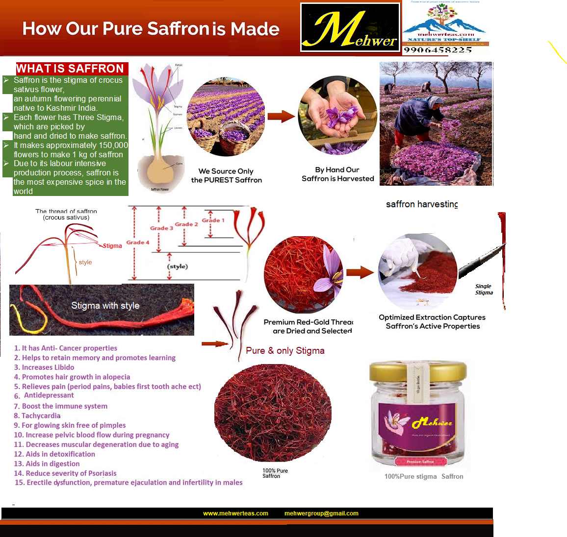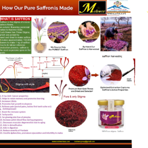 Saffron’s unique compounds, crocin and picrocrocin, are responsible for its brilliant golden hue and signature bitter flavor, while the volatile oil safranal provides its distinctive aroma. Crocin is water-soluble, making this saffron ideal for both culinary and medicinal applications. From flavoring rice dishes like Zaafrani Pulao and desserts such as saffron ice cream, to enhancing traditional beverages like Thandai, saffron is a culinary treasure, imparting a rich color and subtle aroma that elevates every recipe.