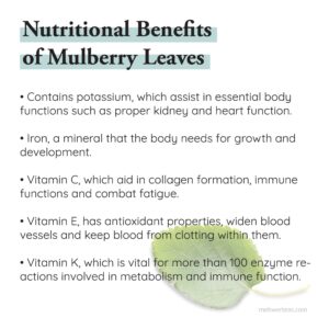 The leaves also contain quercetin, which supports liver function, flavonoids with strong antioxidant properties, and carotenoids that may protect eye health and reduce cancer risk. Additionally, White Mulberry is rich in calcium, potassium, magnesium, iron, zinc, and essential amino acids, making it a nutrient-dense herbal remedy.