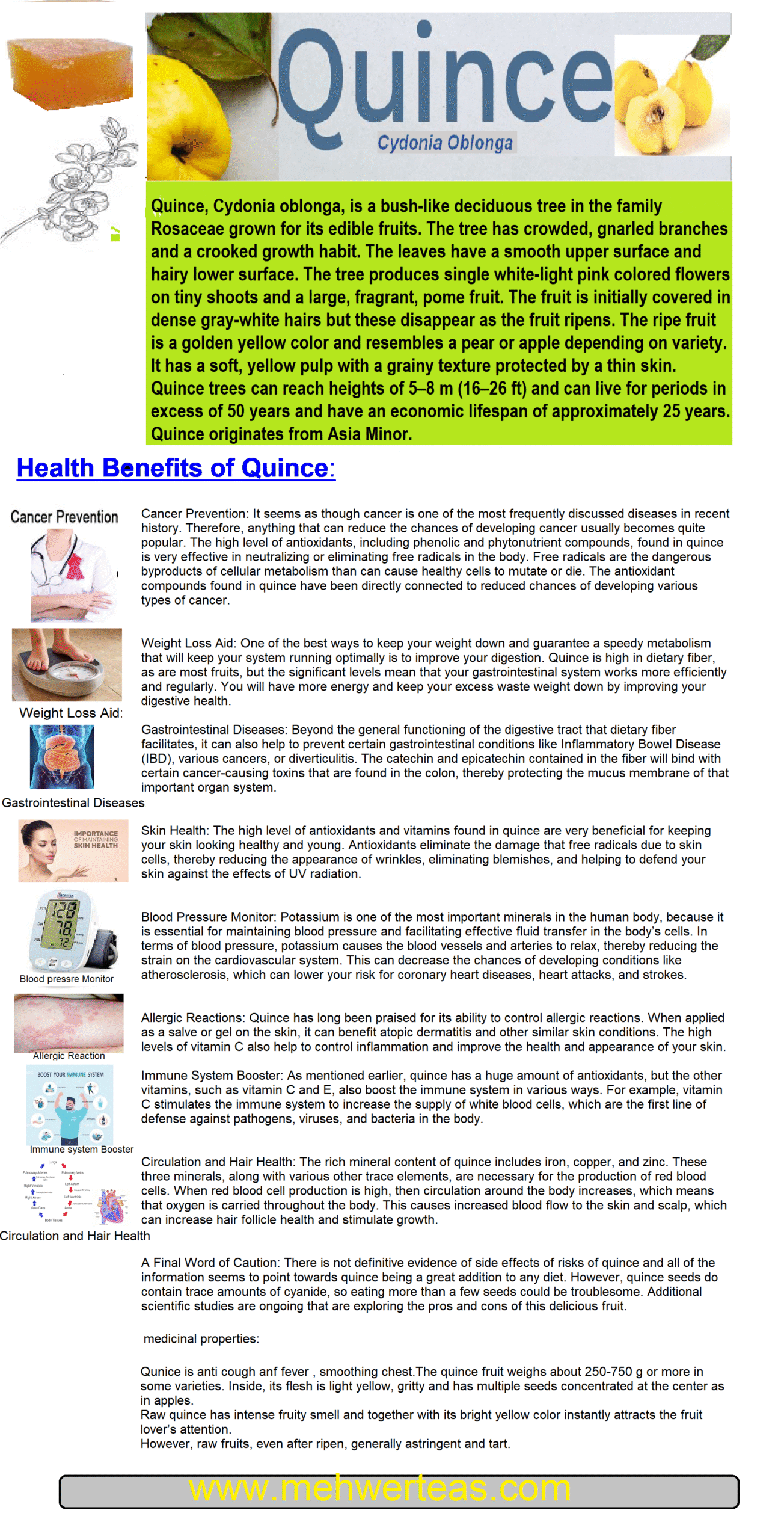 Quince is a versatile fruit that combines traditional medicinal uses with culinary appeal. Whether incorporated into herbal remedies, desserts, or preserves, it offers natural health benefits while adding a unique flavor and aroma to your diet.