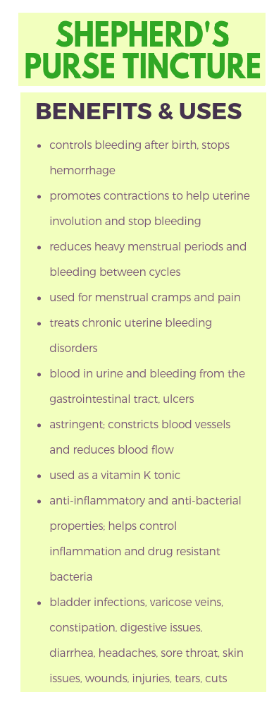 Shepherd’s purse can be taken as a tincture, tea, capsules, or fluid extract. The typical tincture dose is ¼ to ½ teaspoon up to four times a day. Tea can be made from 3–5 grams of the dried herb steeped for 10–15 minutes.